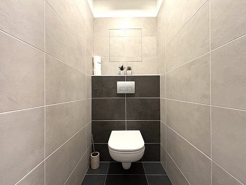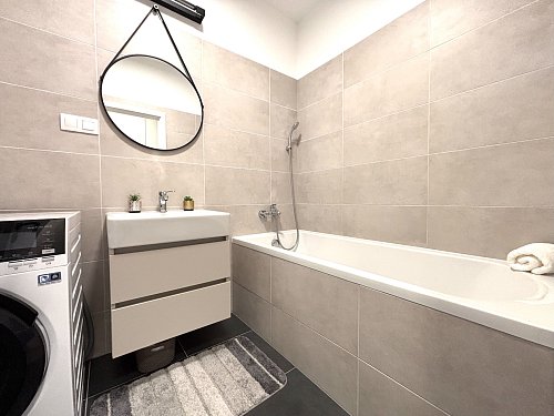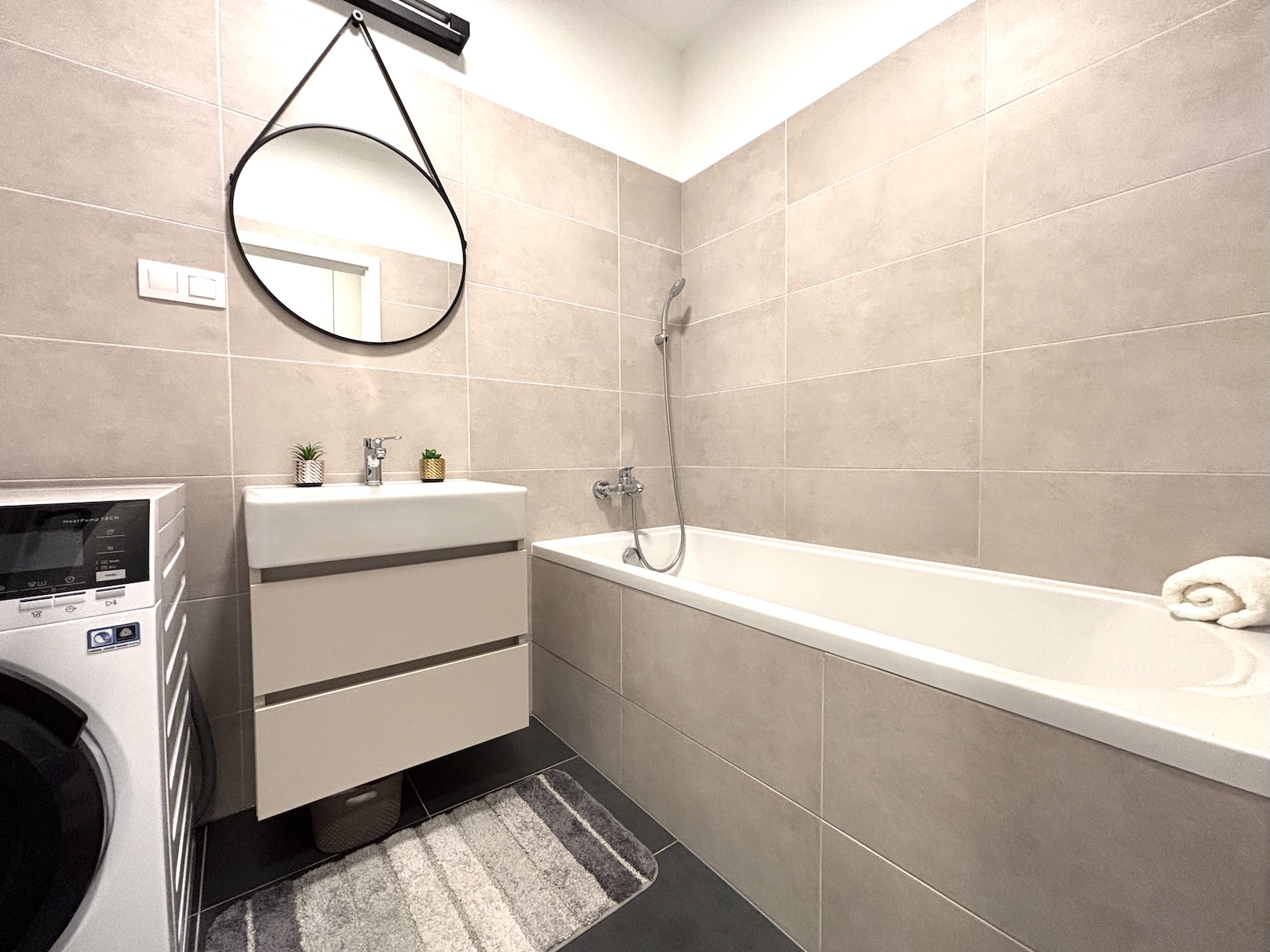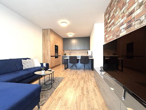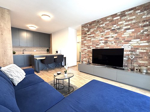 Obývacia izba je prepojená s kuchyňou a doplnená o dizajnový tehlový obklad. Zo spoločenskej časti je výstup na priestrannú loggiu 10 m², ktorá ponúka príjemný priestor na oddych.