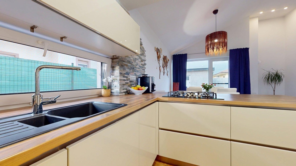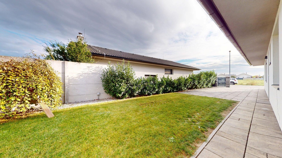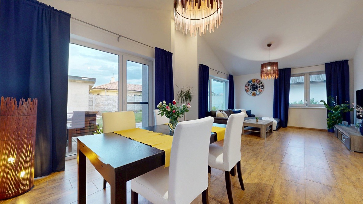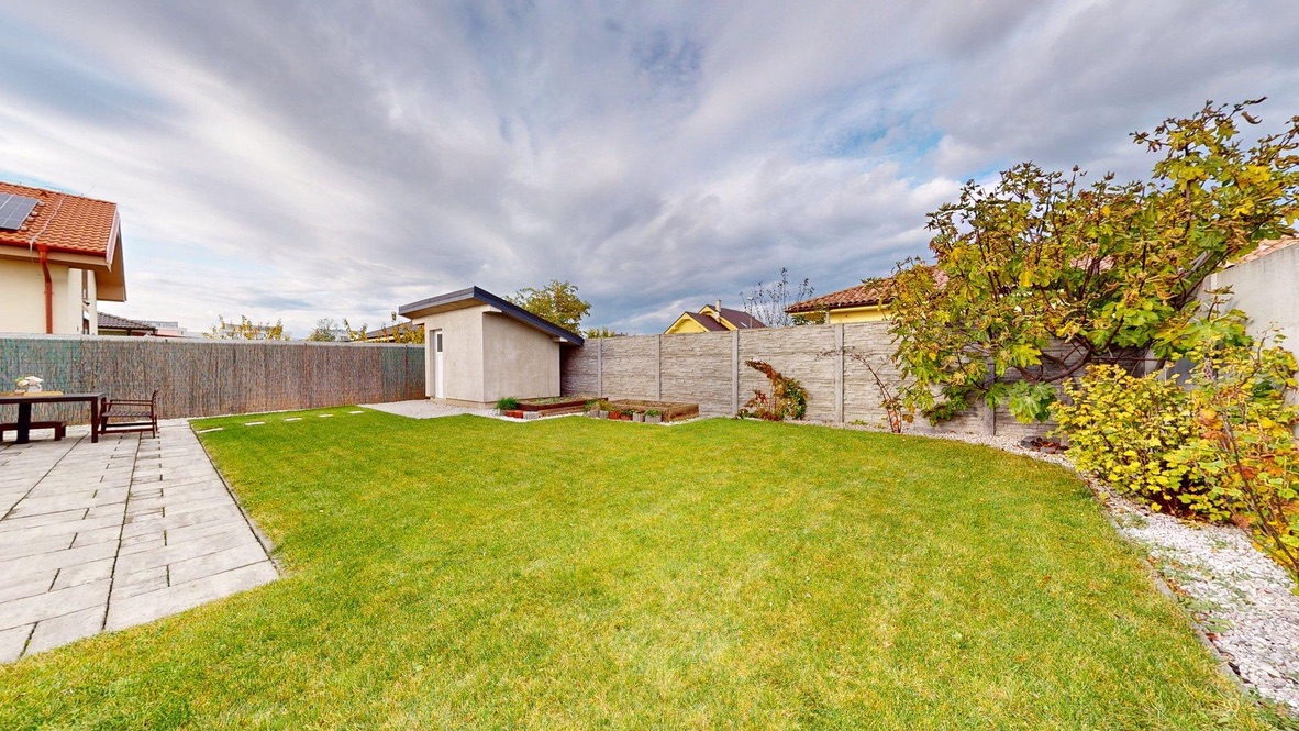 Privíta vás priestranná obývačka so zvýšeným stropom, ktorá dodáva celému priestoru hĺbku a vzdušnosť. Kuchyňa so skrytou komorou poteší každého, kto ocení poriadok a praktické úložné riešenia. Z dennej časti sa plynulo prechádza do záhrady – miesta, kde sa spomaľuje čas a kde si naplno vychutnáte pokojné rána aj letné večery pri grile.