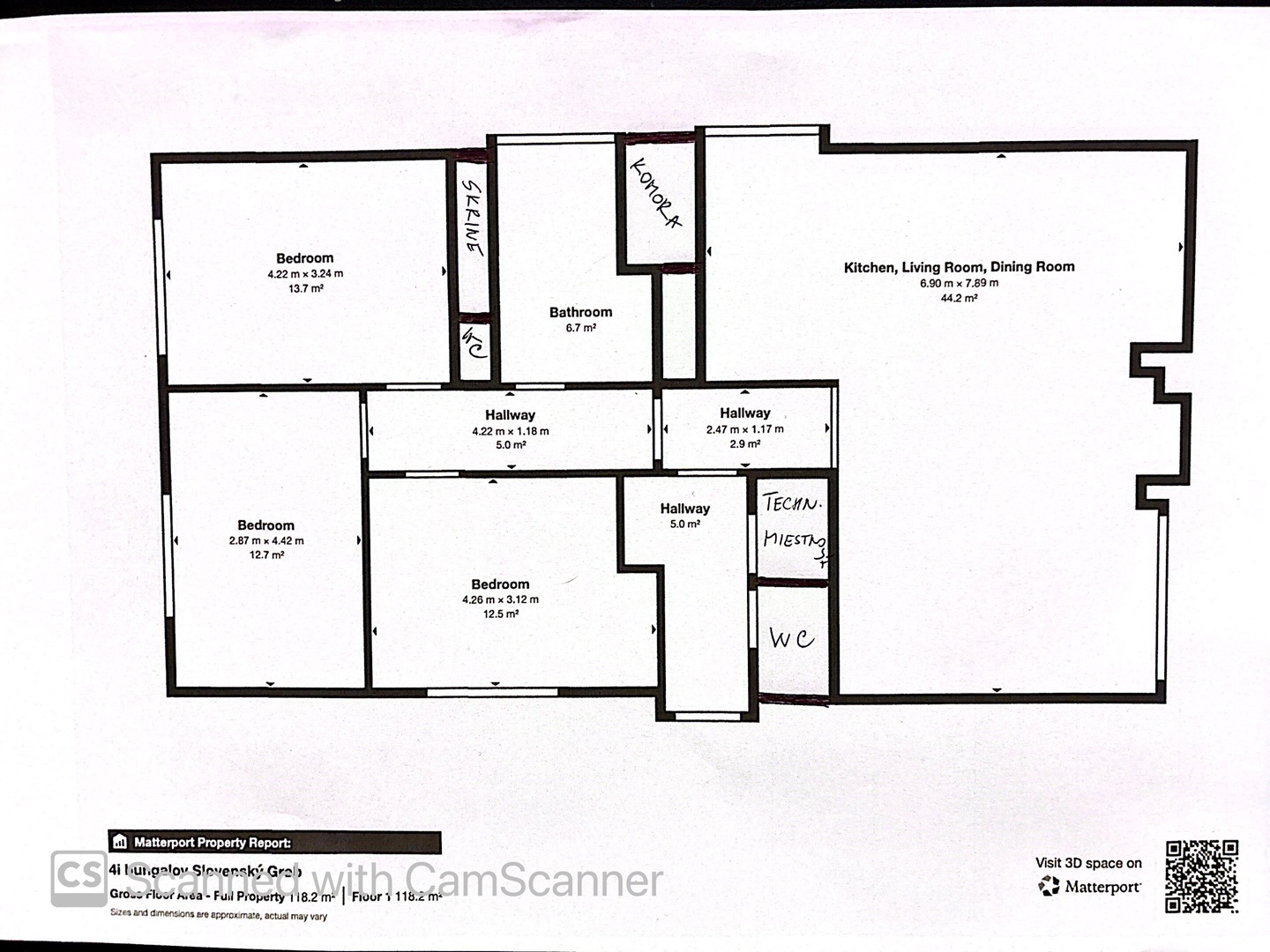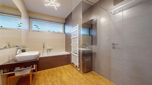 • kúpeľňa s vaňou aj sprchovacím kútom + samostatné WC