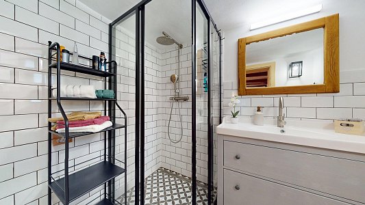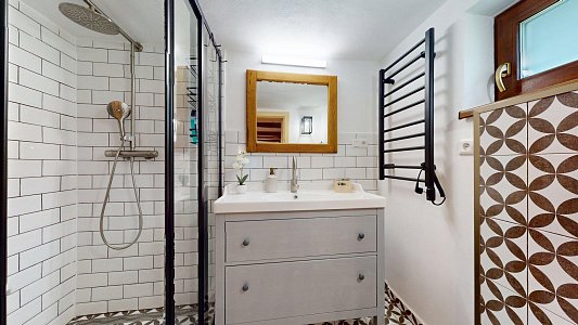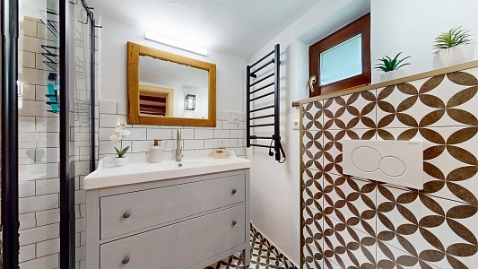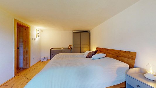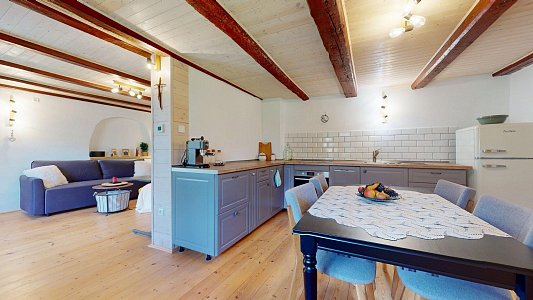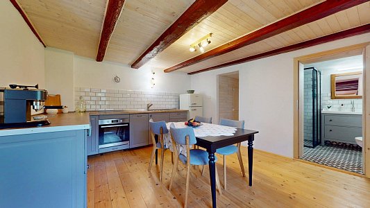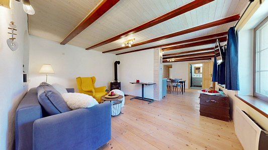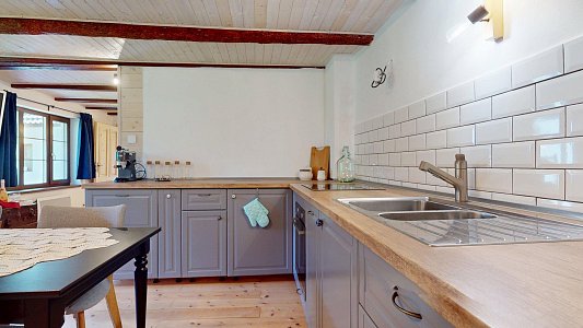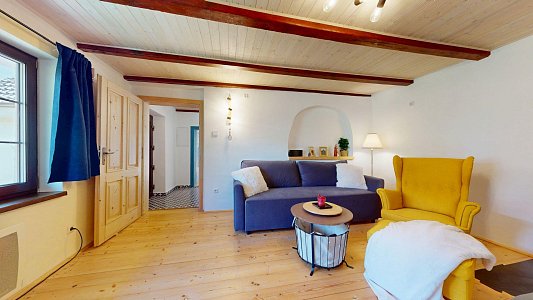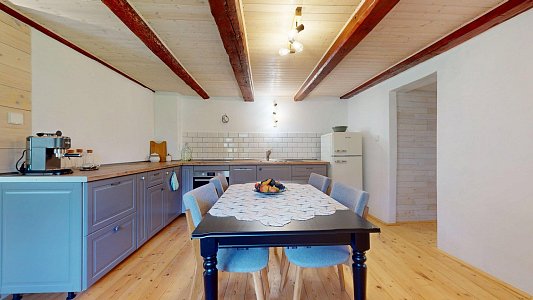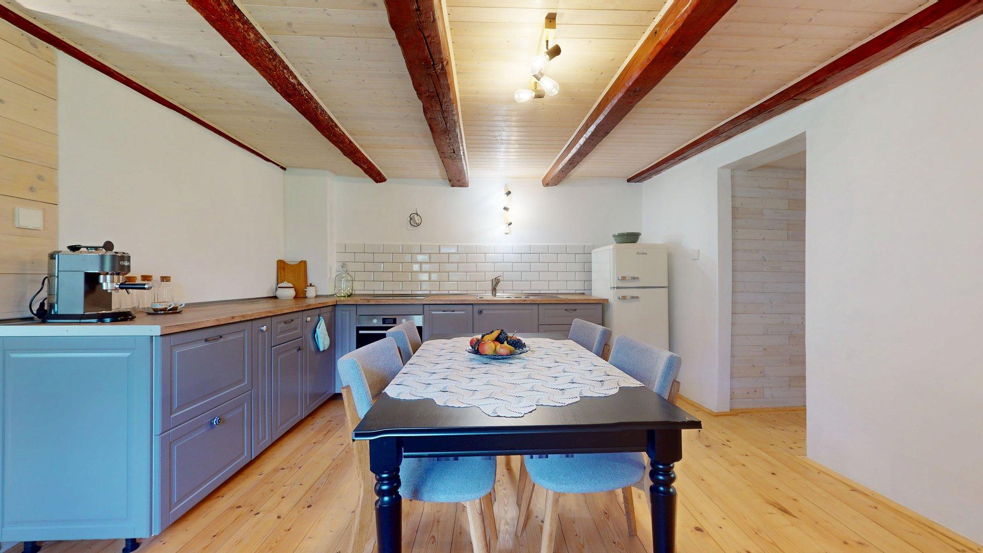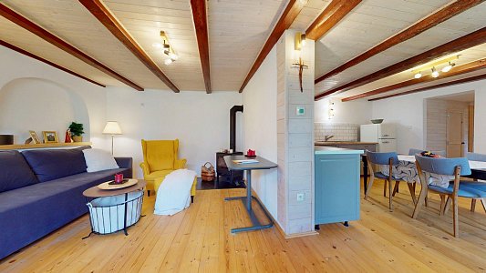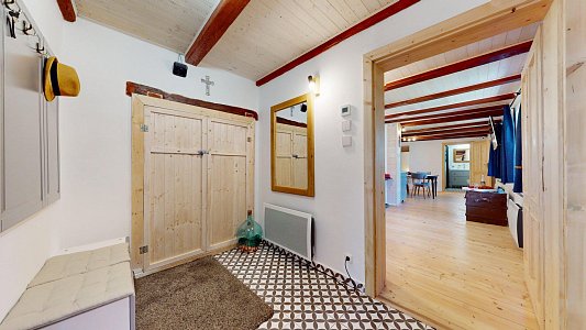 Za hrubými múrmi nájdete 3 priestranné izby s priznanými trámami, veľkú kuchyňu spojenú s obývačkou, ktoré tvoria srdce domu, modernú kúpeľňu s toaletou a dve technické miestnosti. Rustikálne detaily, drevené podlahy a krbové kachle vytvárajú útulné miesto na jesenné večery s knihou, či pohárom vína.